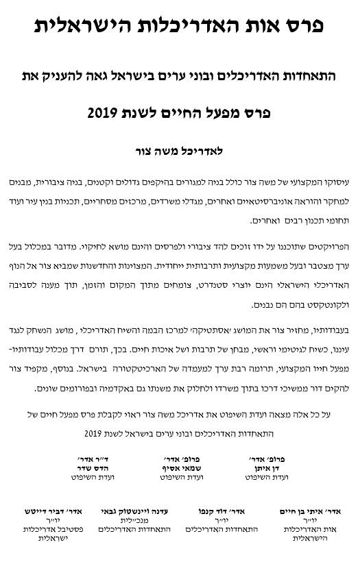 עבור פרוייקט חדשני ובעל פוטנציאל לשנות מציאות בסביבה תכנונית מאתגרת, בו ניכרת חשיבה מחוץ לקופסא. הקונספט התכנוני מרכיב מכלול בו הכלל עולה על חלקיו וברגישות אינו מתפתה לייצר מרחב מקומי מדי, אך גם לא זר לסביבתו.